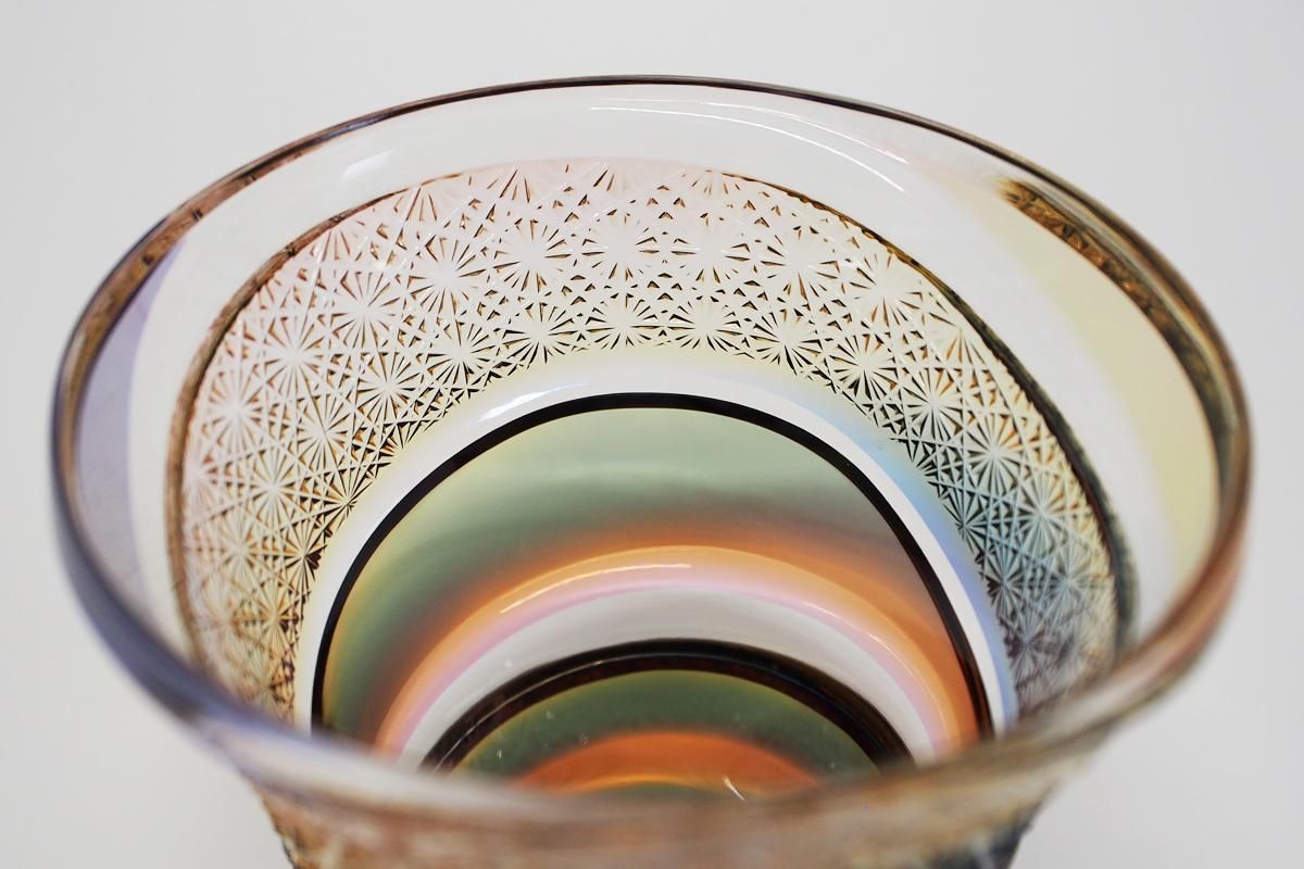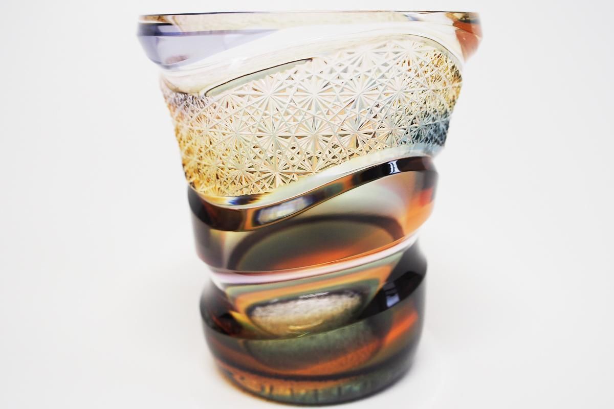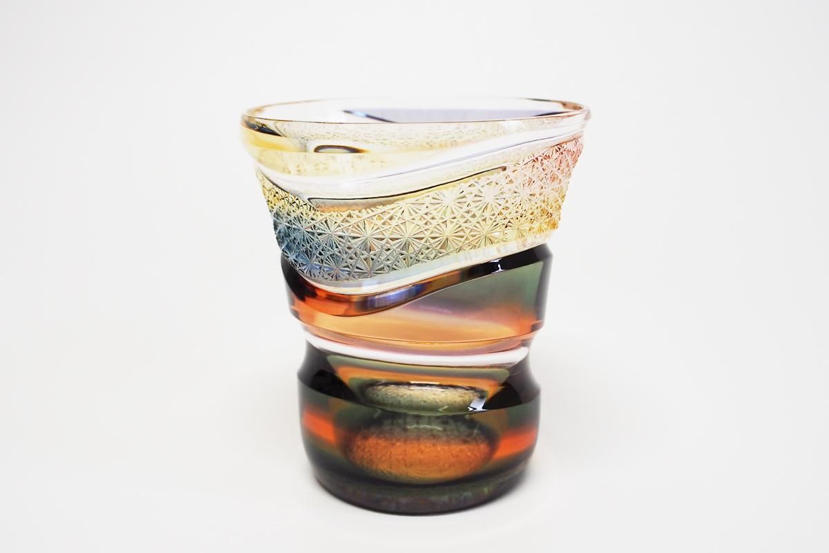All Uno glass pieces are one-of-a-kind, created by Kouhei Kobayashi using his original "Sagging faceting(kiriko)" technique. First, the vessels are made in an electric furnace using the sagging technique, which utilizes heat and gravity, and then kiriko is applied to the shaped vessels to complete the process. The name "Uno glass" has two meanings. One is that he creates each piece by himself, from the production of the glass material to the final product, The other is that when sagging, the glass melts and falls through the hole, which looks like the letter U.