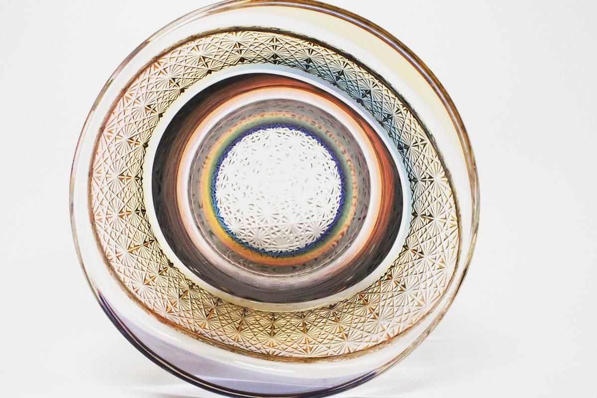 「サギング」は電気炉を使用したガラス工芸技法のひとつで、丸い穴の開いた板状の型の上に板ガラスを置いて熱することで、穴からガラスを落として器をつくる技法です。そのサギングと切子を組み合わせたオリジナル技法が「サギング切子」です。
